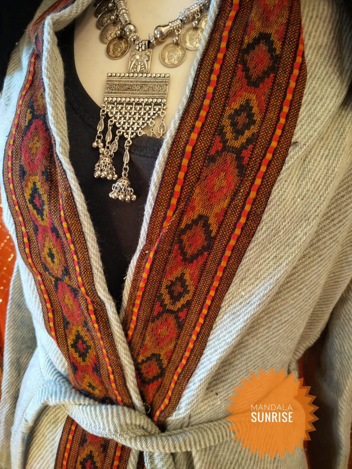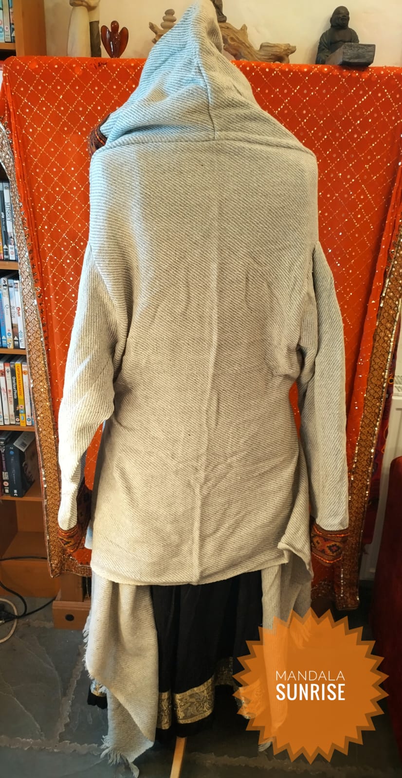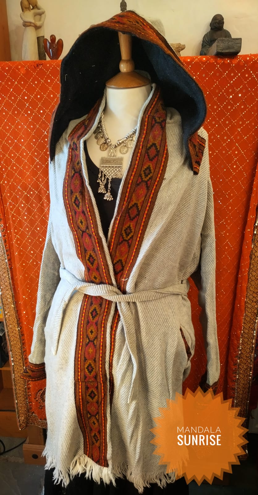 They are a Waterfall design and feel a bit like blankets (blend of cotton wool and acrylic). The sleeves and hood are fleeced so snuggly in the winter. They are good quality and wash well on a low temperature.