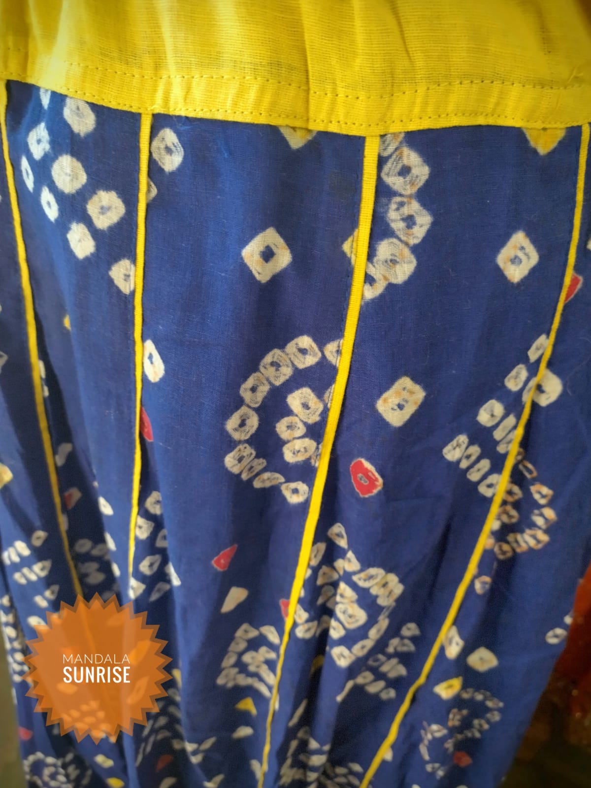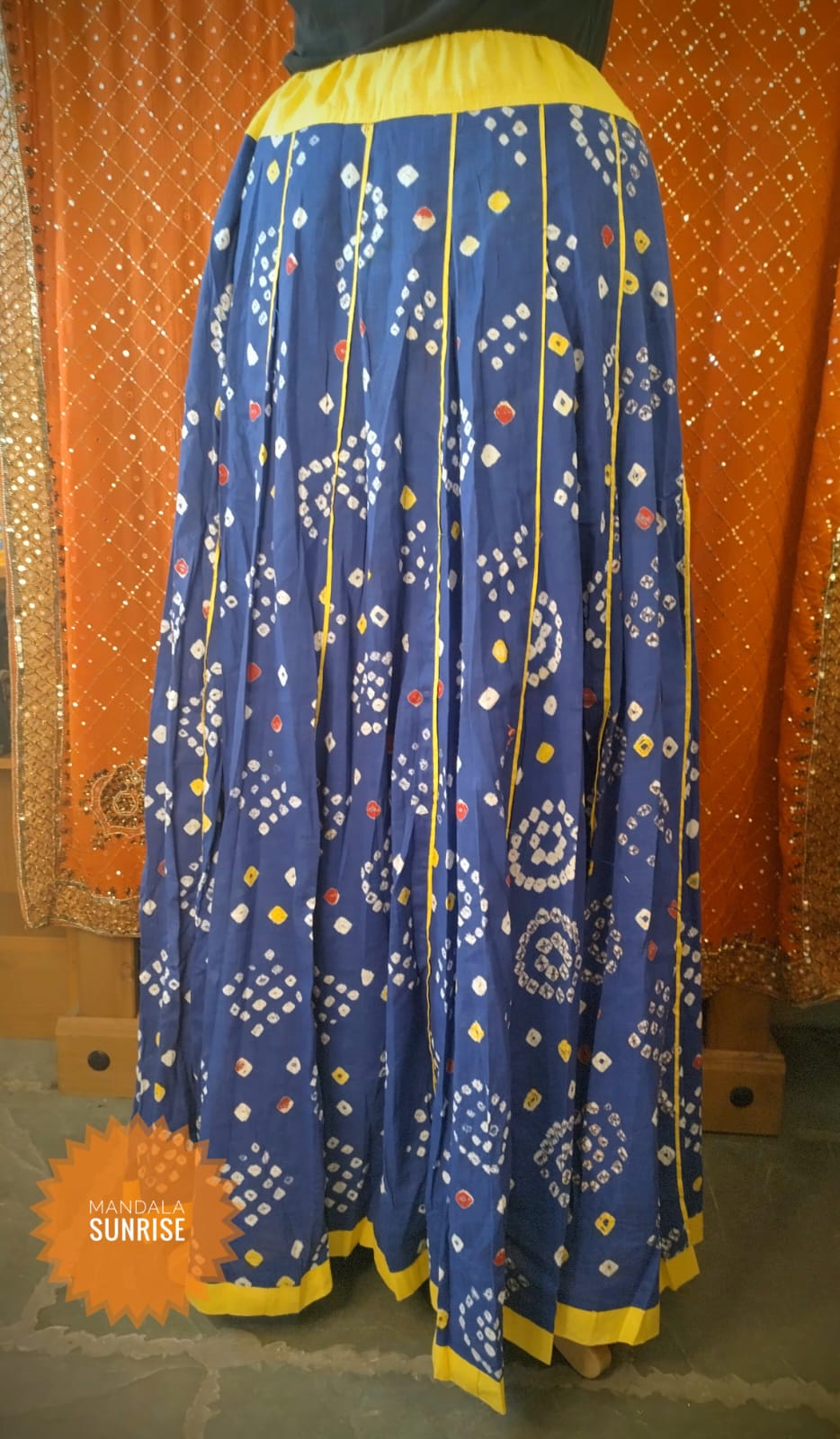 Lovely blue Indian skirt with yellow trimmings and white red and yellow patterns