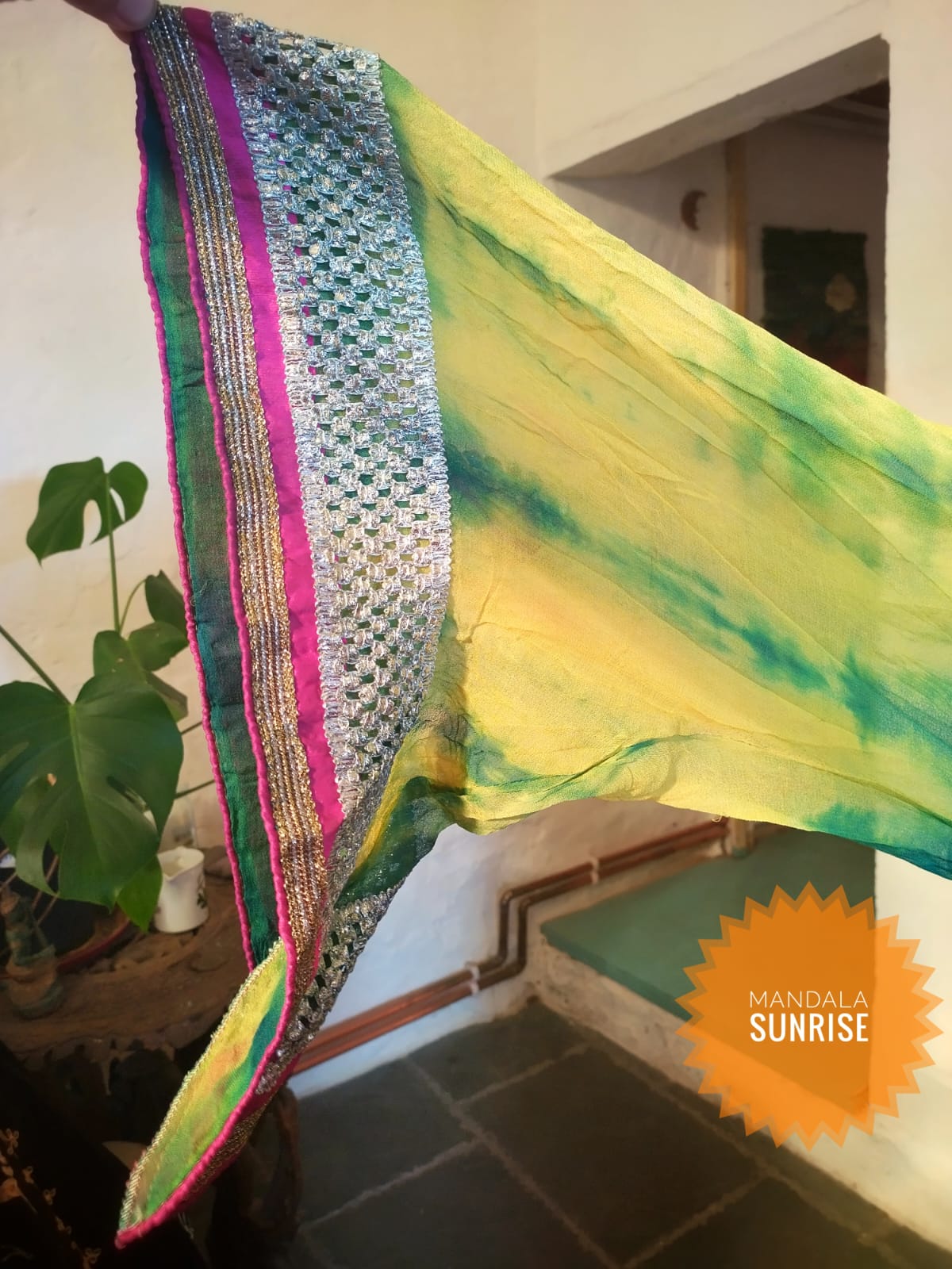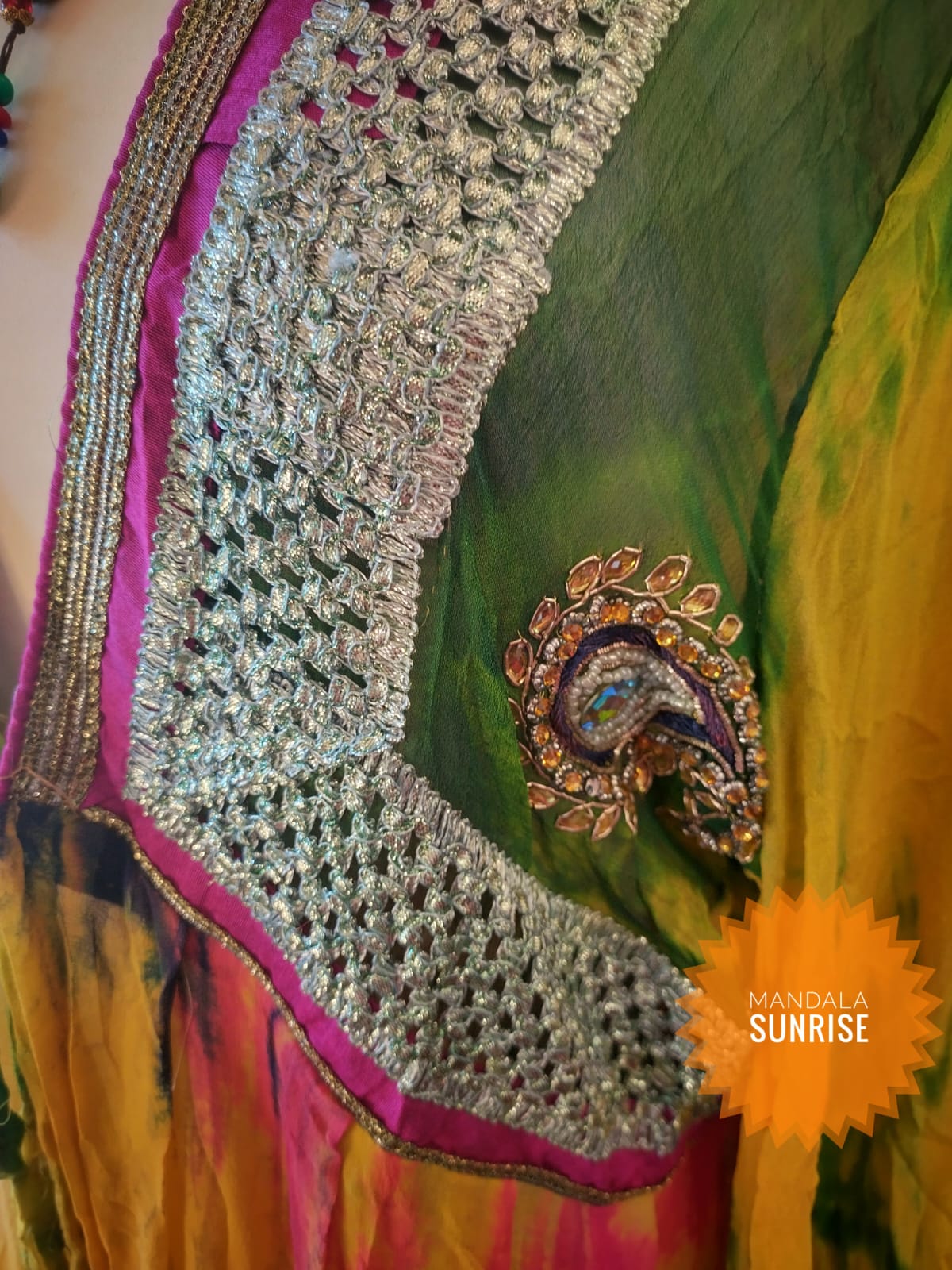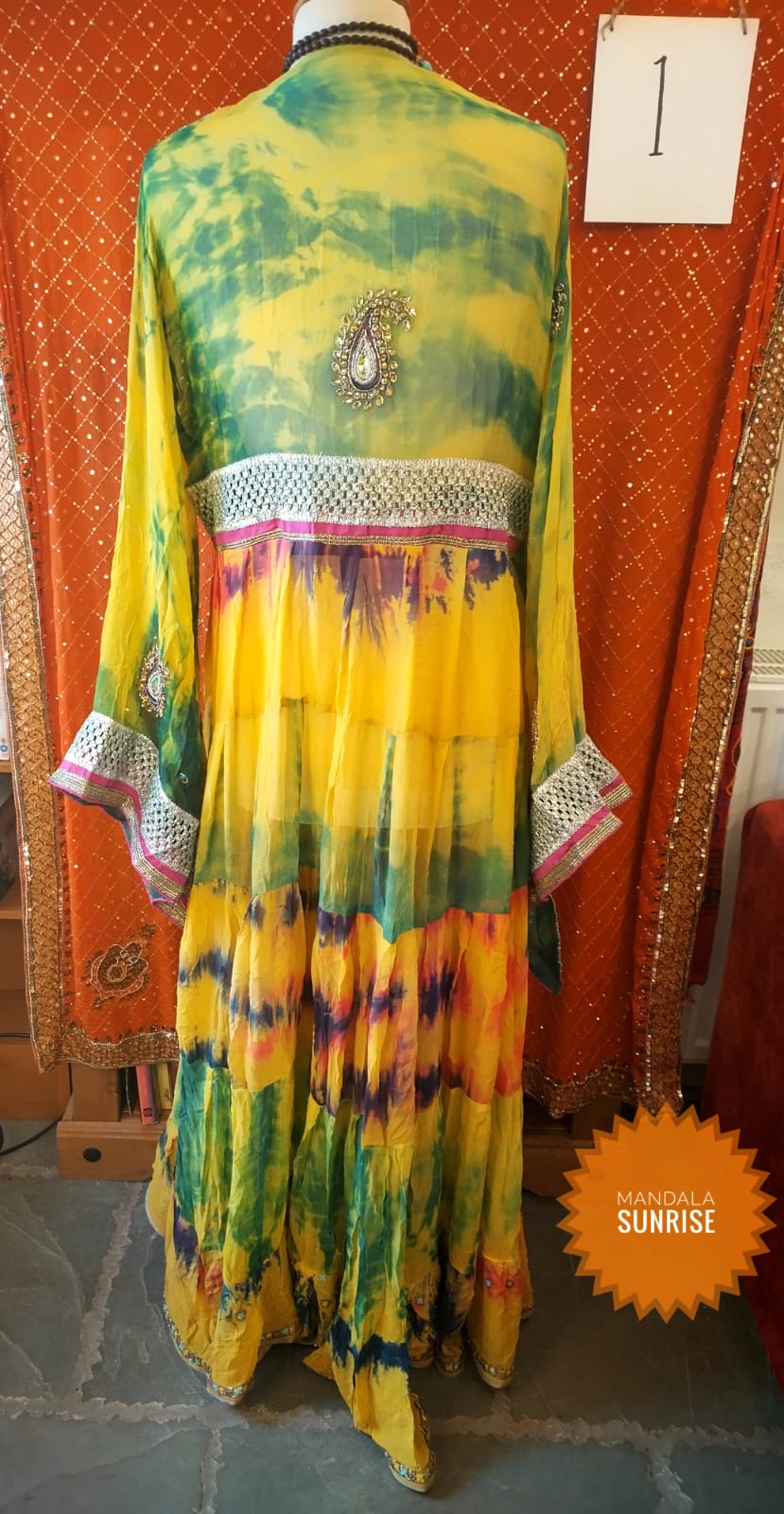 This beauty has wizard sleeves with a silver and cerise trim and paisley embellishments on chest and back and other areas. The hem is embellished with yellow pink and turquoise jewels. The main body is yellow with tye dye patterns.