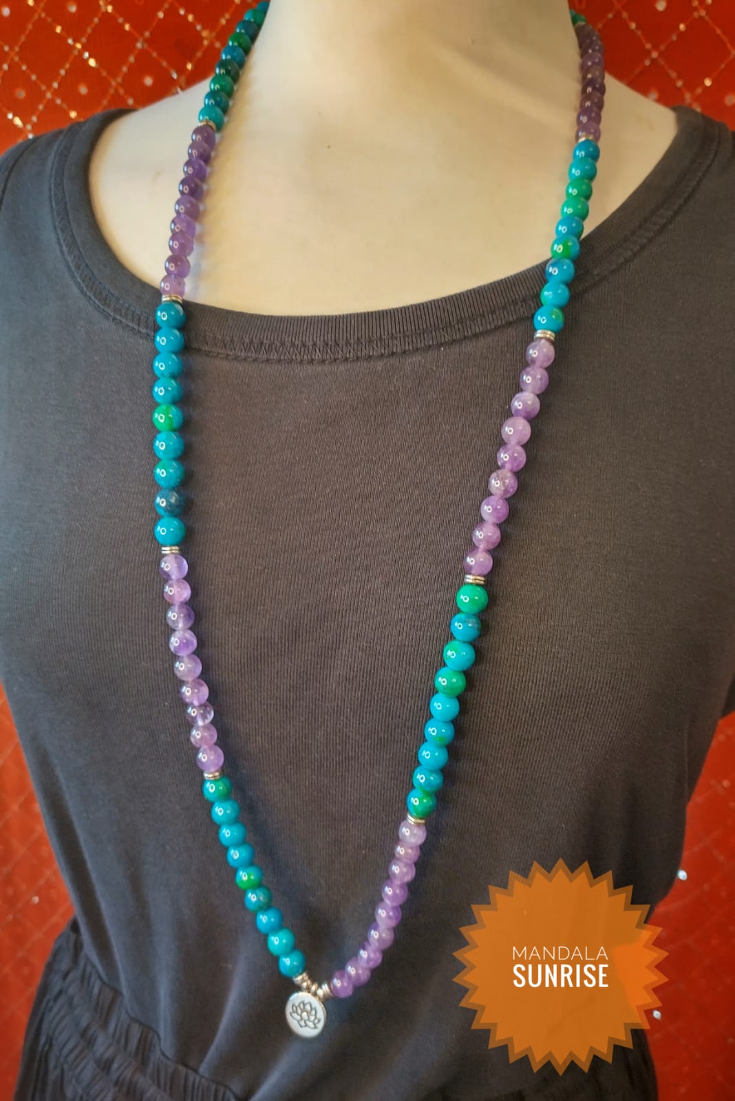 Chrysocolla and amethyst beads with lotus charm. Comes in a velvet bag