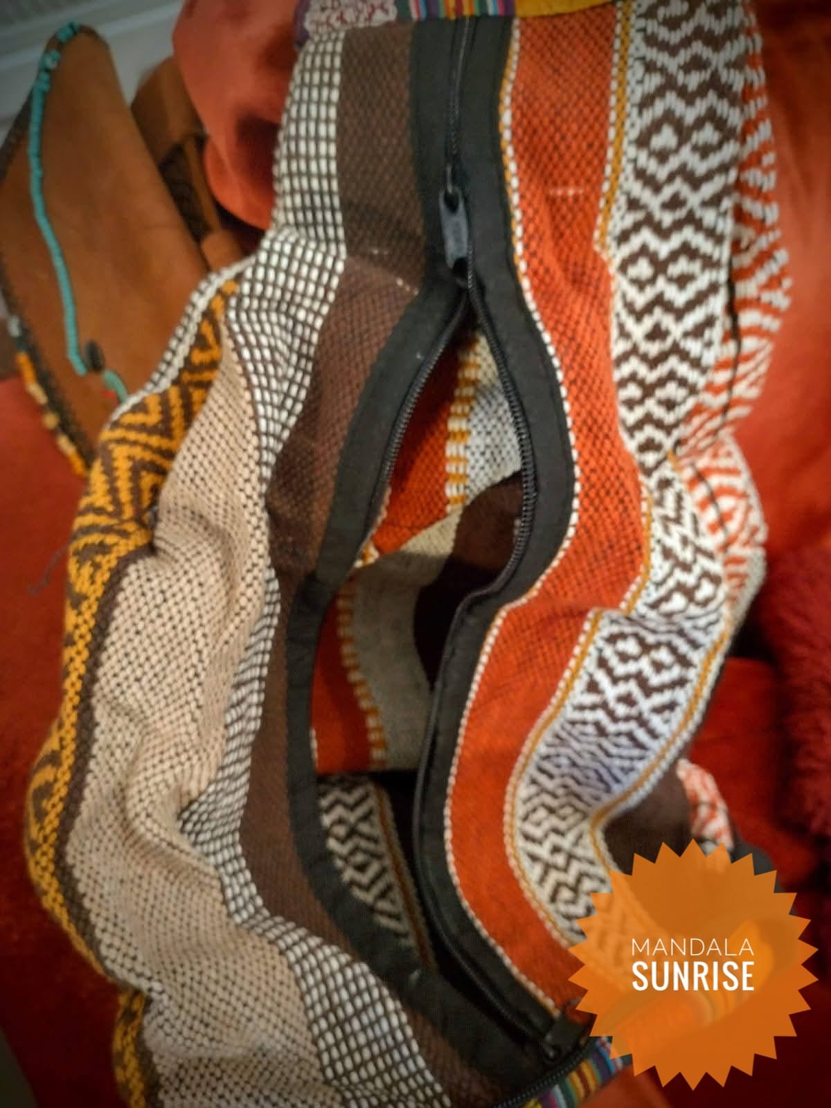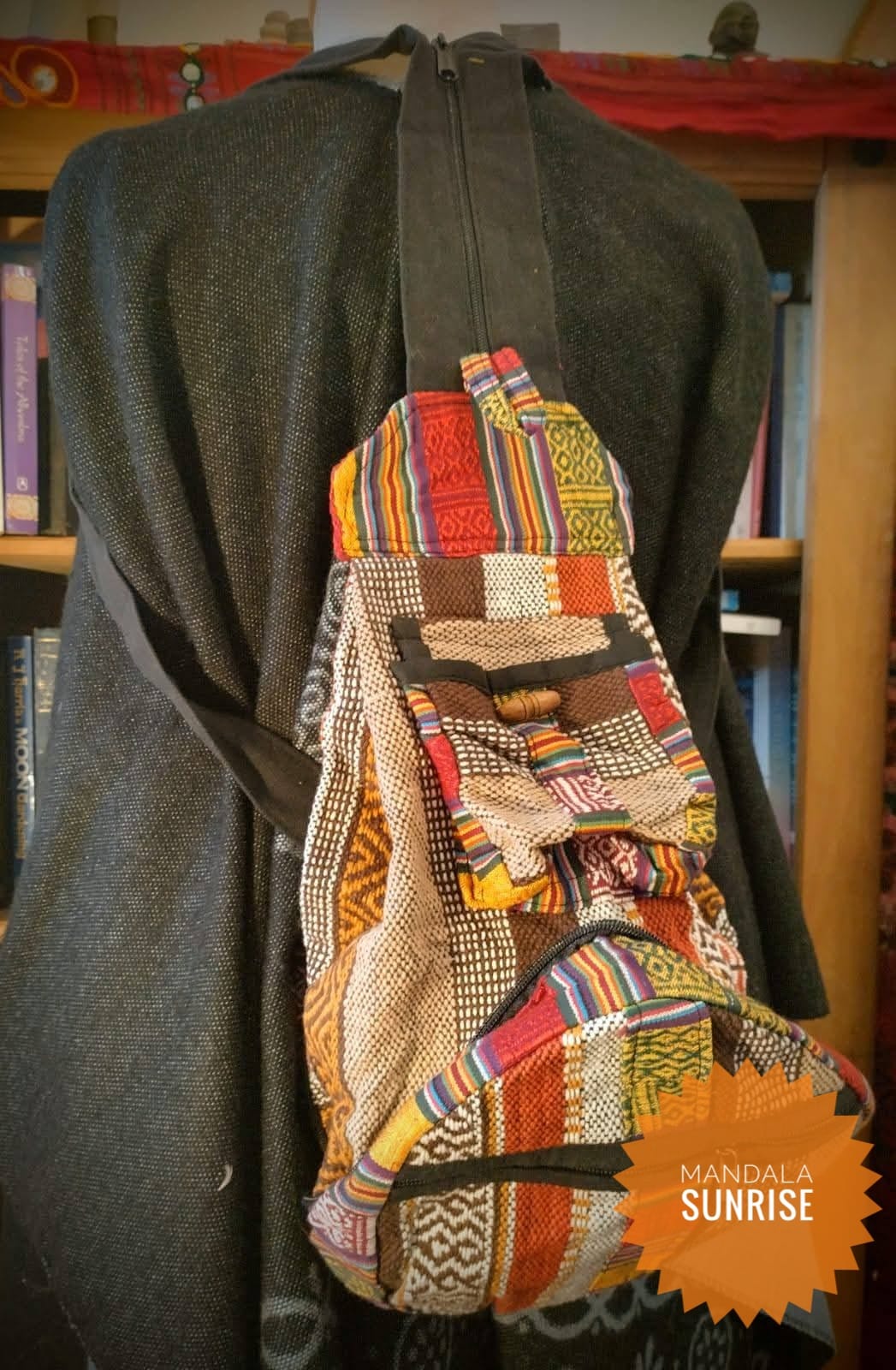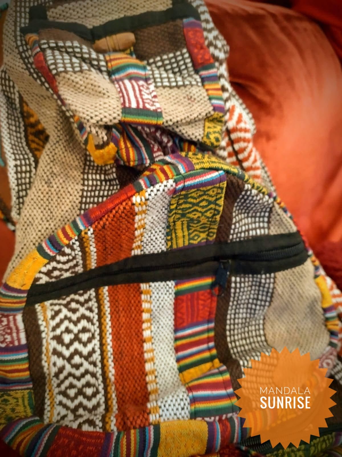 Great hippy rucksack which folds into a usable bag that can be held or looped onto a belt!!. The most versatile bag I have ever seen and funky too!!